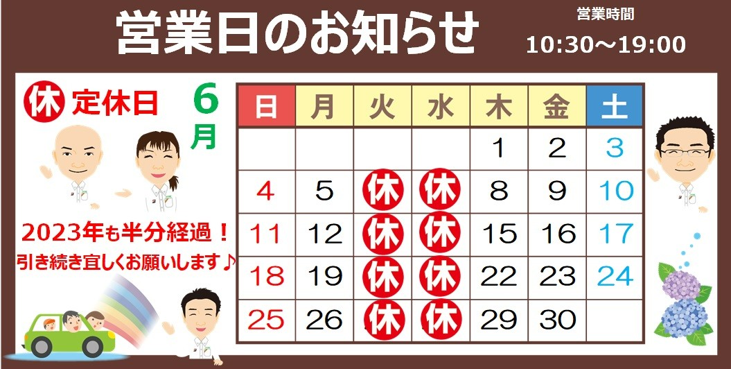 6月定休日のお知らせ ポスト 2023年5月28日 いつもタイヤ館酒田をご利用いただき誠にありがとうございます! 6月の定休日と、営業時間に関するご案内です♪ 開店 10時30 閉店 19時 最終作業受付 18時15分 2023年も早くも半分経過の月です!!! 引き続きタイヤ館酒田を宜しくお願い致します。 カテゴリ:お知らせ