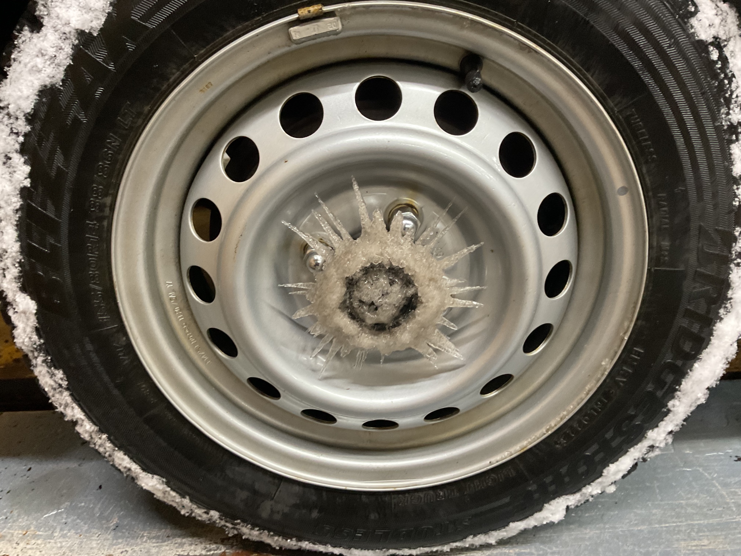 ホイールキャップが凍っていて、見たことのない状態になってました(´⊙ω⊙`)