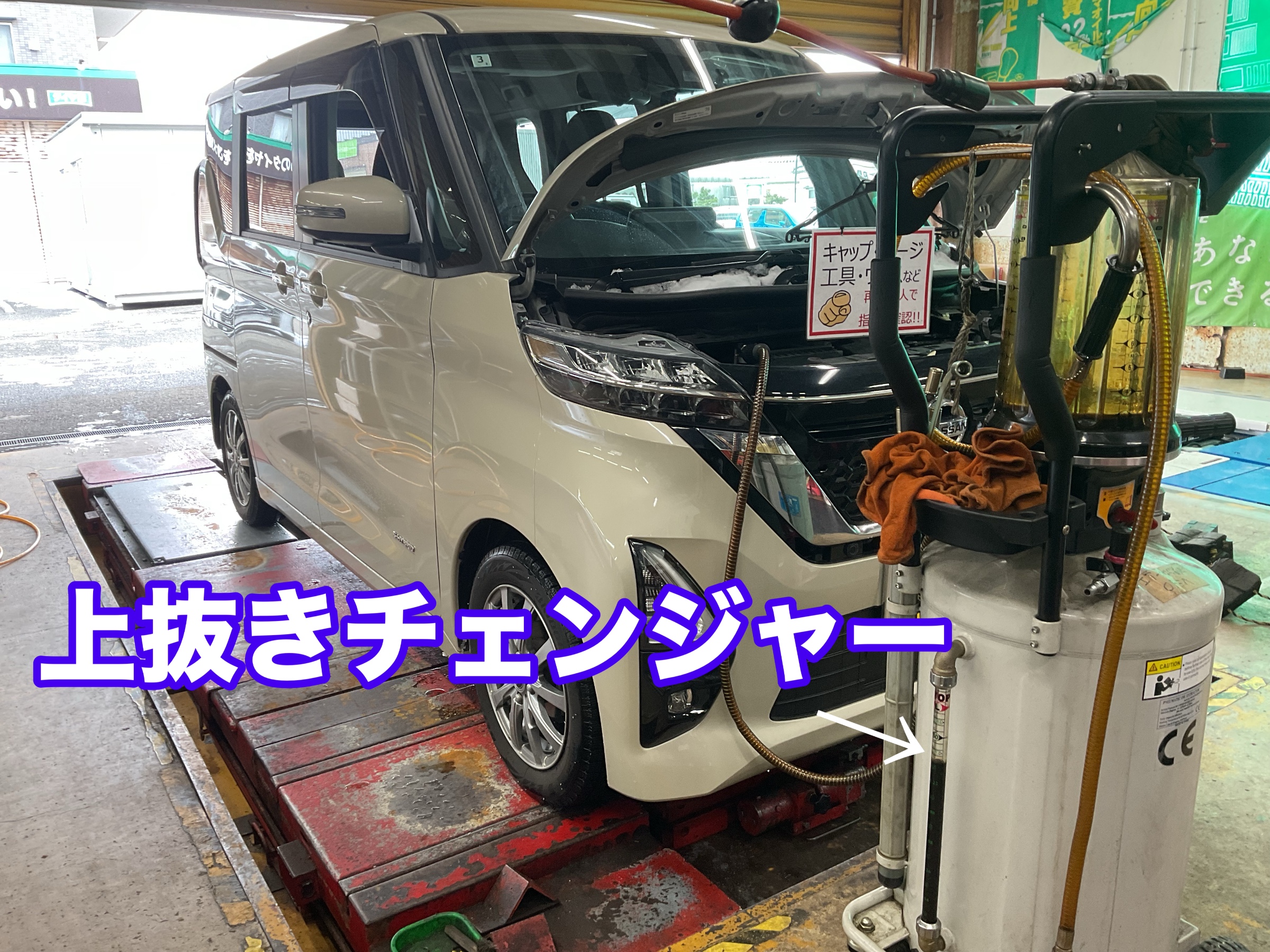 左の赤いゴルフは上抜きチェンジャーで。右のワゴンRスマイルは下抜きでオイル交換しています。