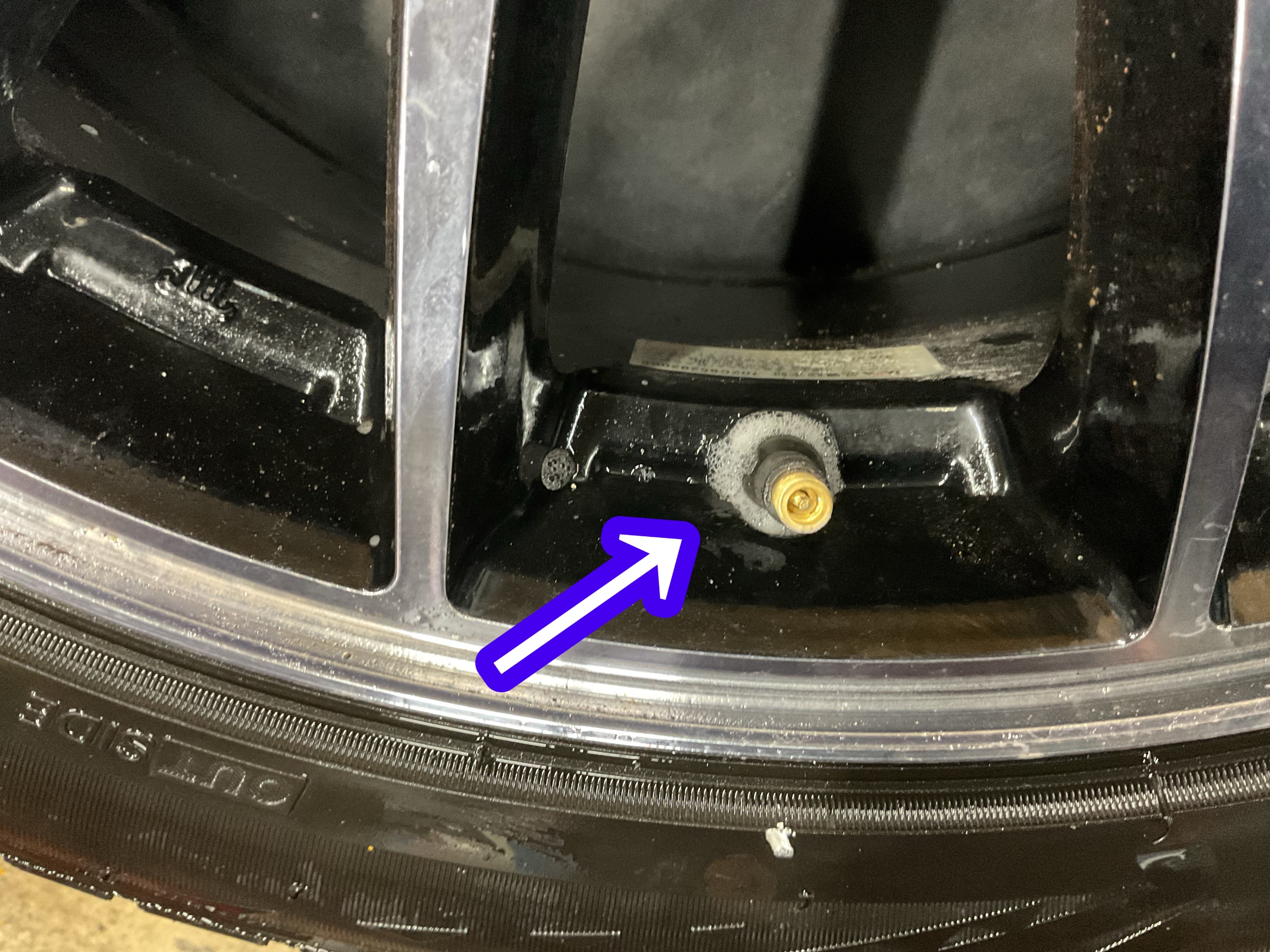 矢印の部分 チューブレスバルブ から小さな泡がでていますよね? なかなか発見しづらいんです。