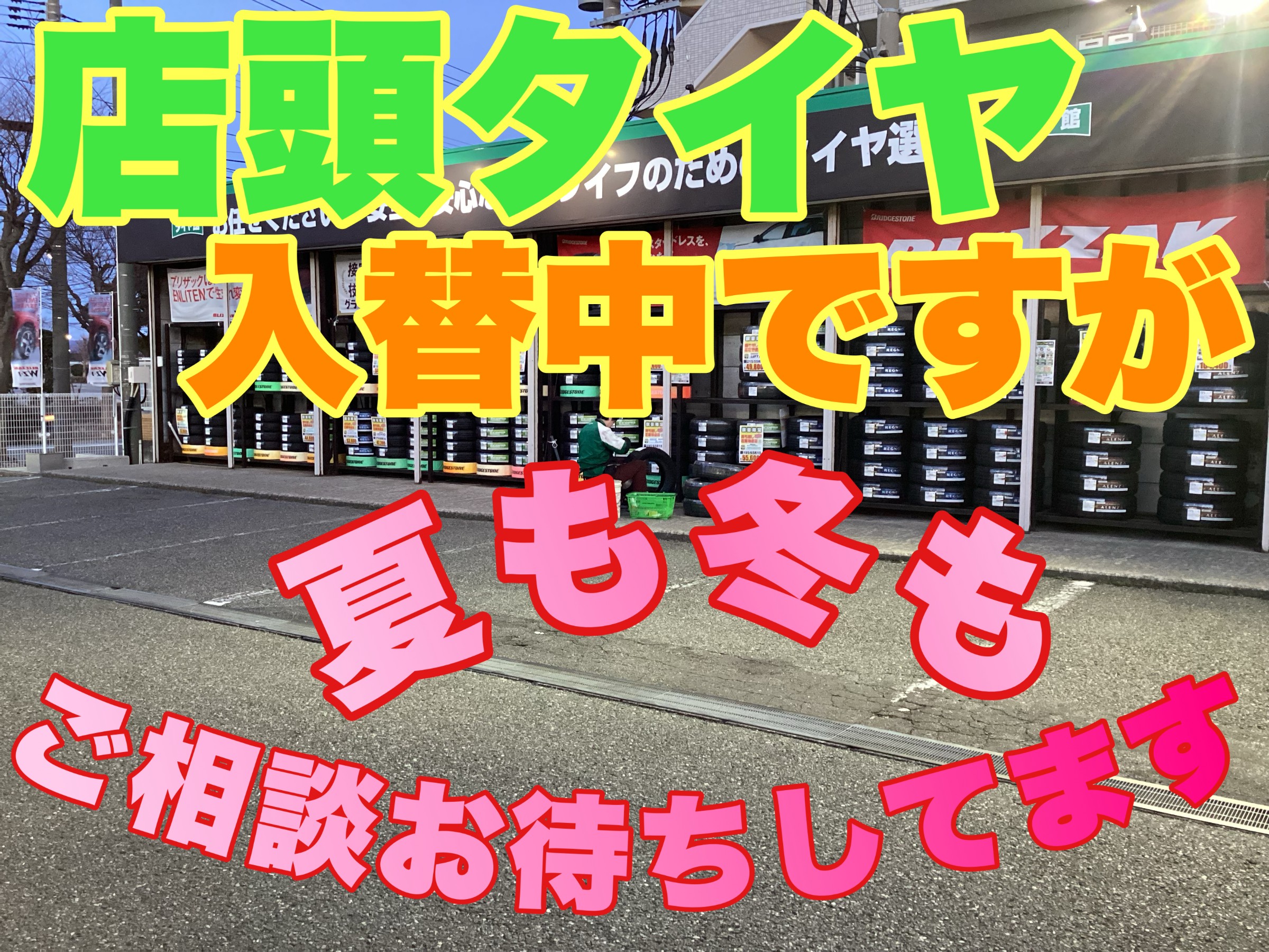 ただいま当店では店頭のタイヤガレージのタイヤ入替中!