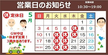 5月定休日のお知らせ 5/2~5/6のGW期間中は休まず営業いたします。