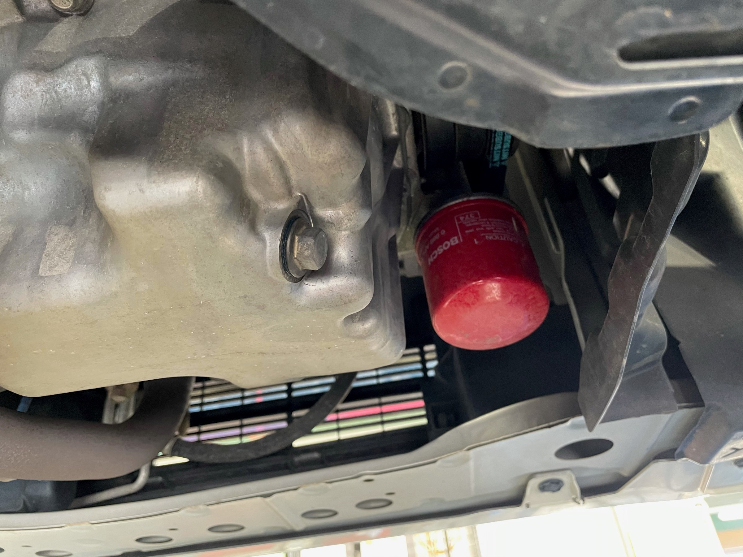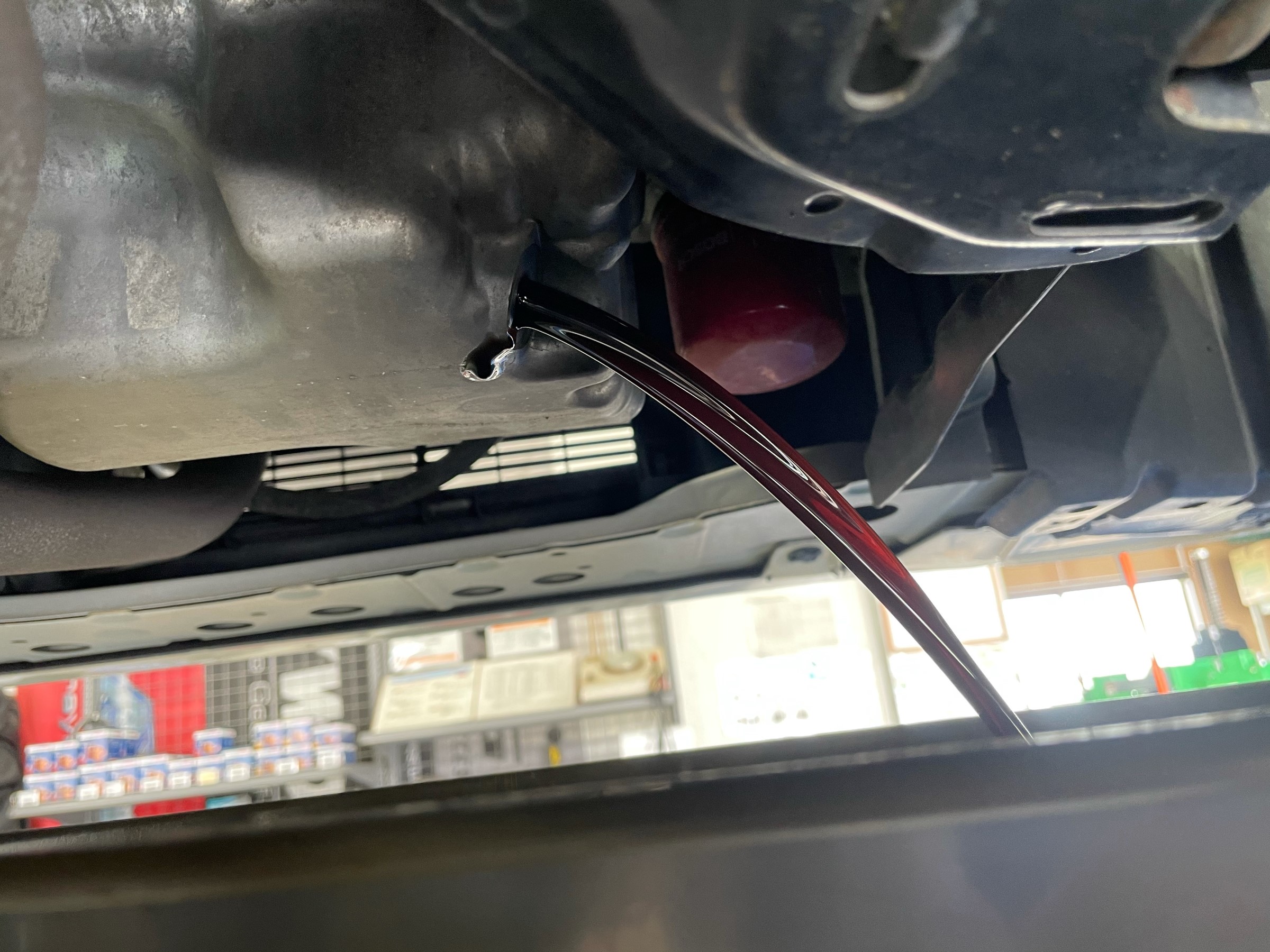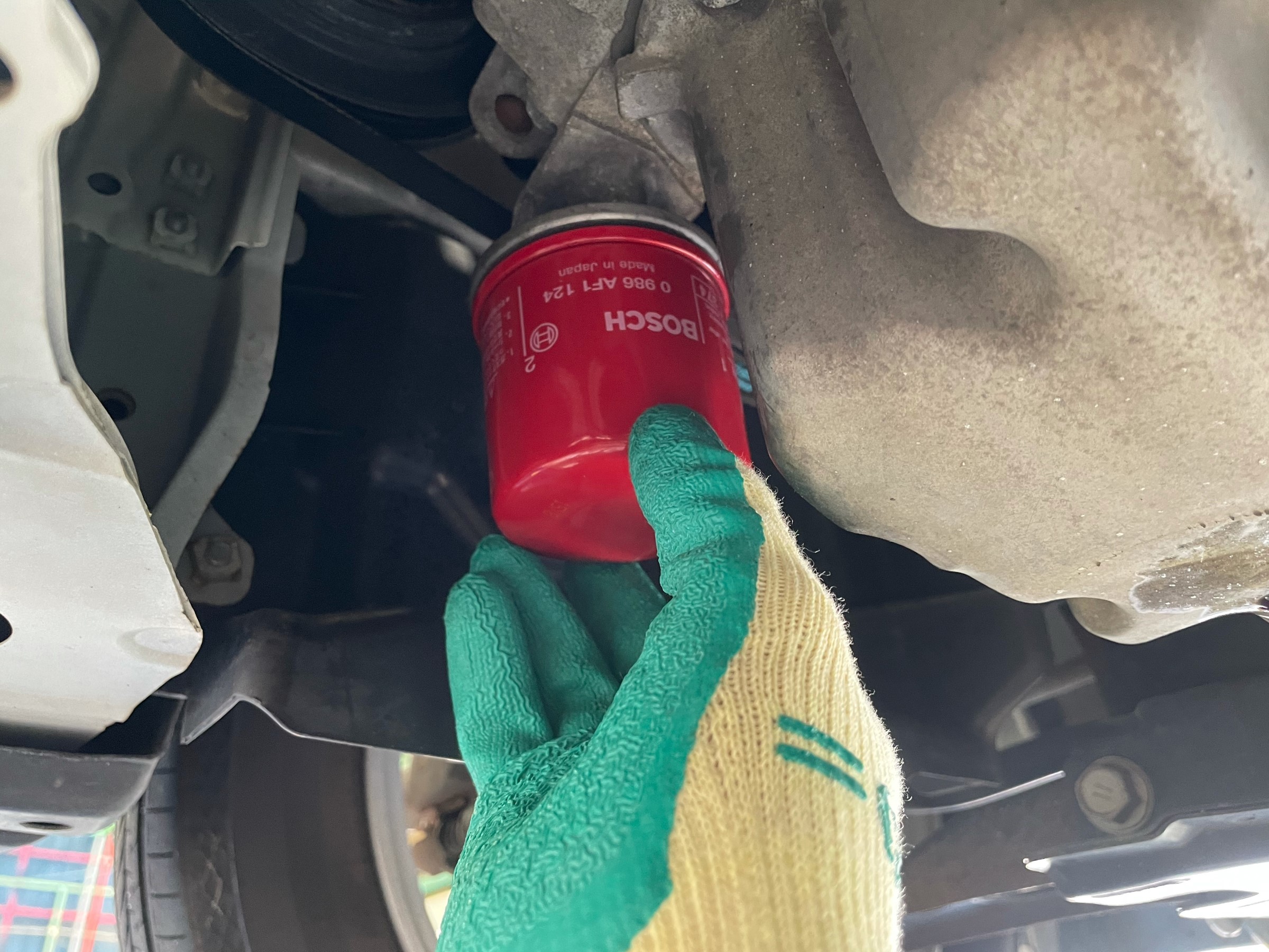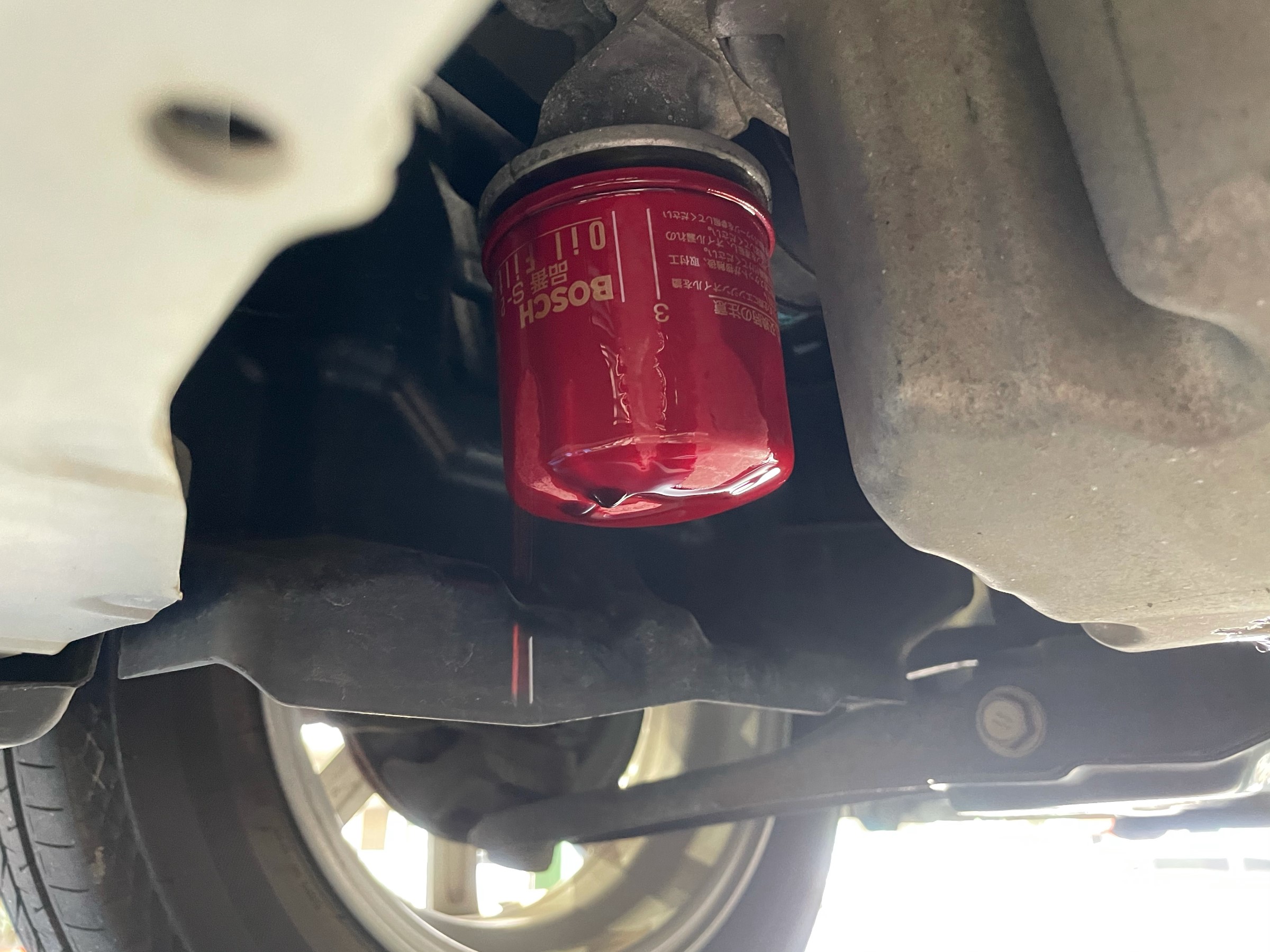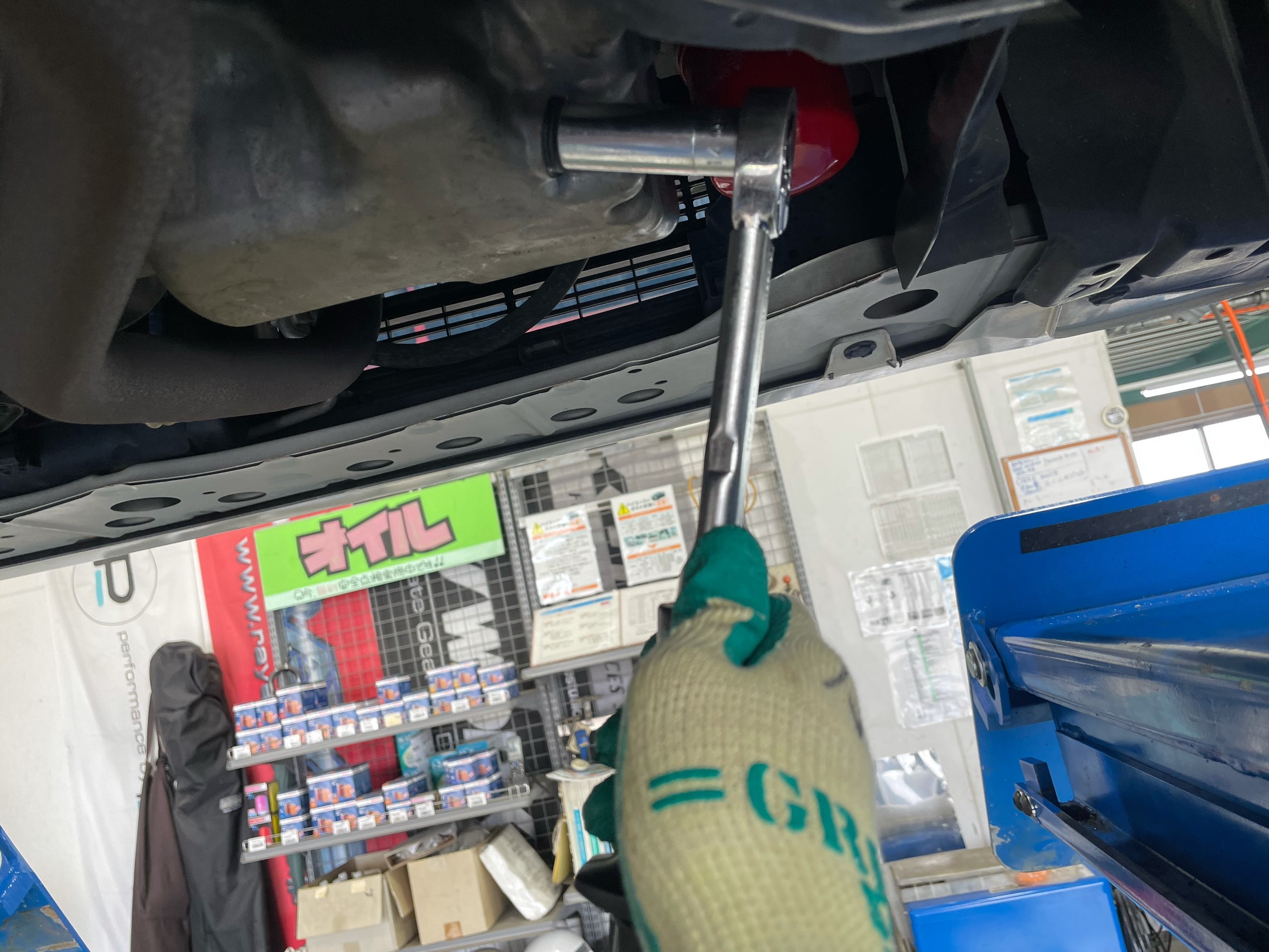 エレメント取付後、リフトを下げてオイルを入れます。