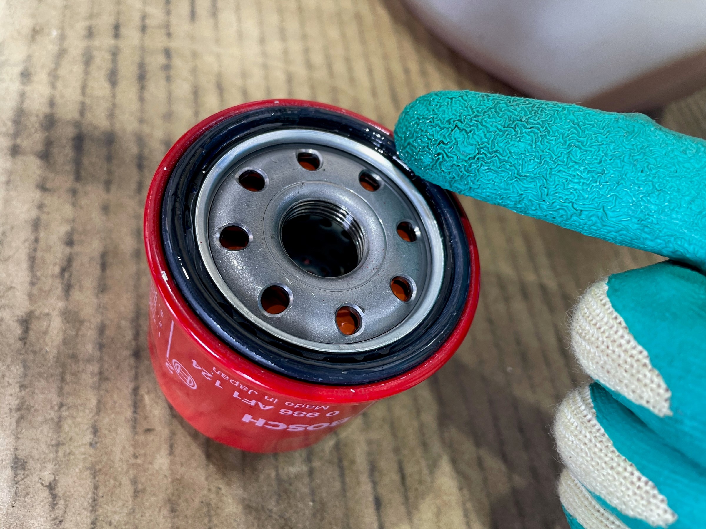 オイルエレメント取付前にパッキンにオイルを塗布します。