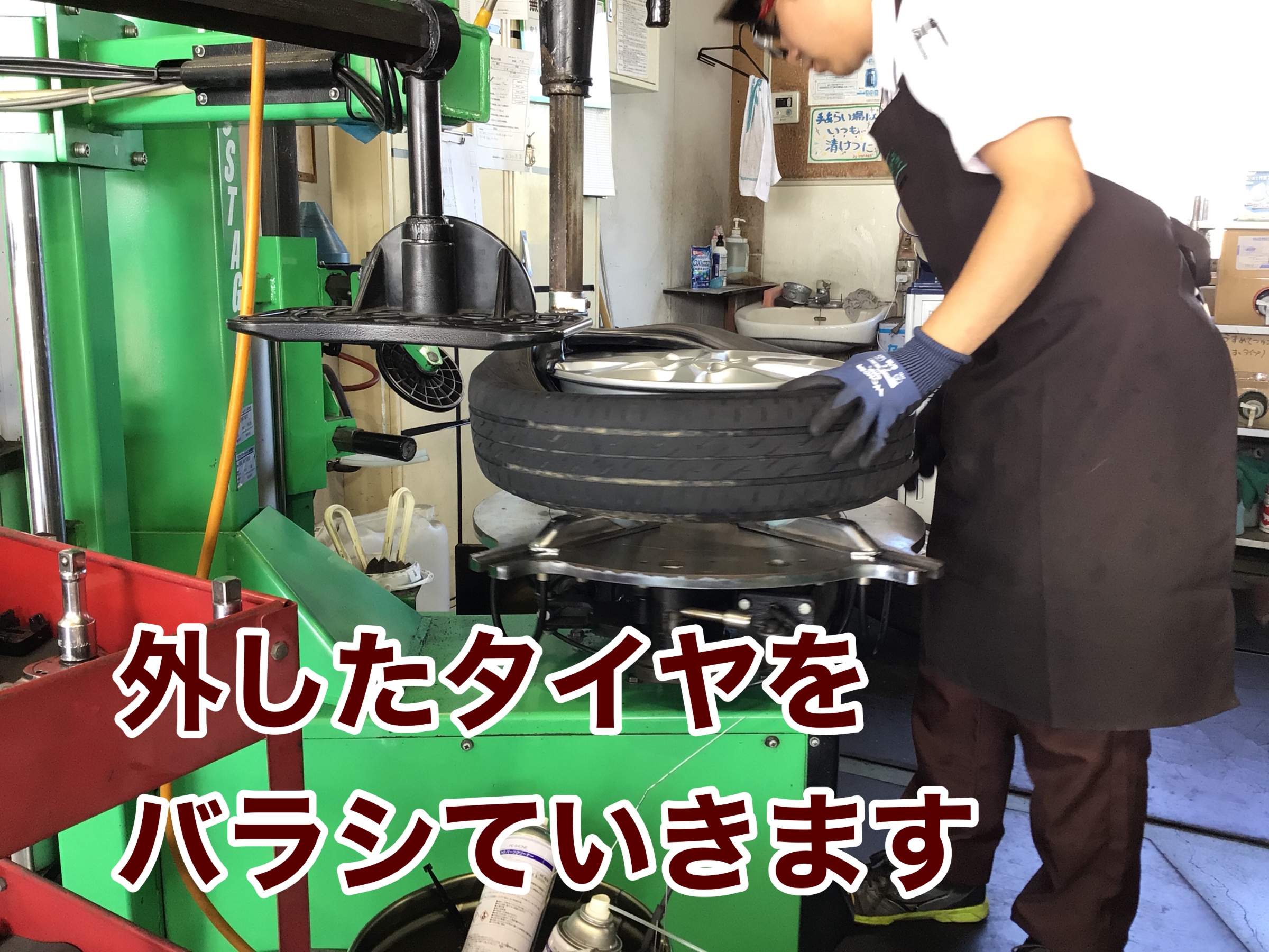 外したタイヤをチェンジャーにかけ、バラシます!