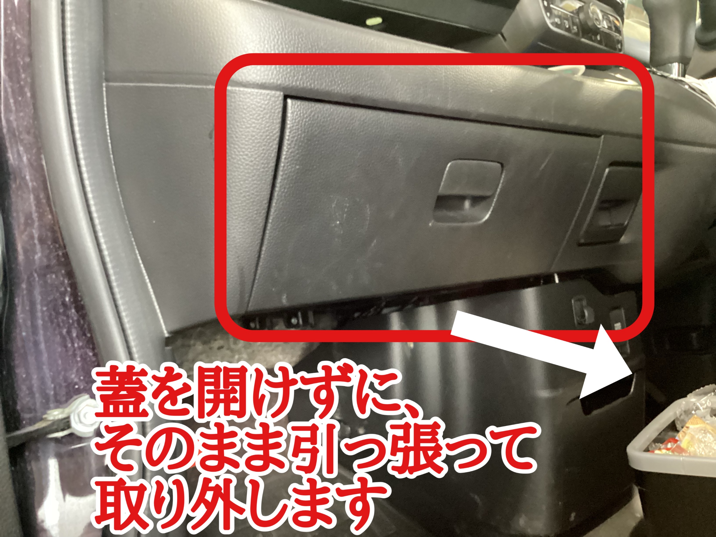 グローブボックスは下の方に指をかけ、