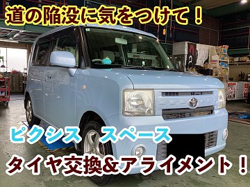 道の陥没気を付けて!『ピクシススペース タイヤ交換&アライメント実施!』