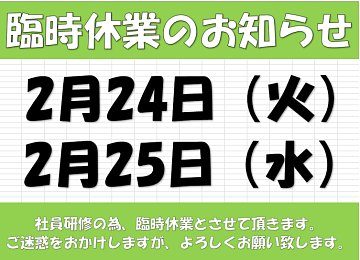 2/24(火)臨時休業のお知らせ