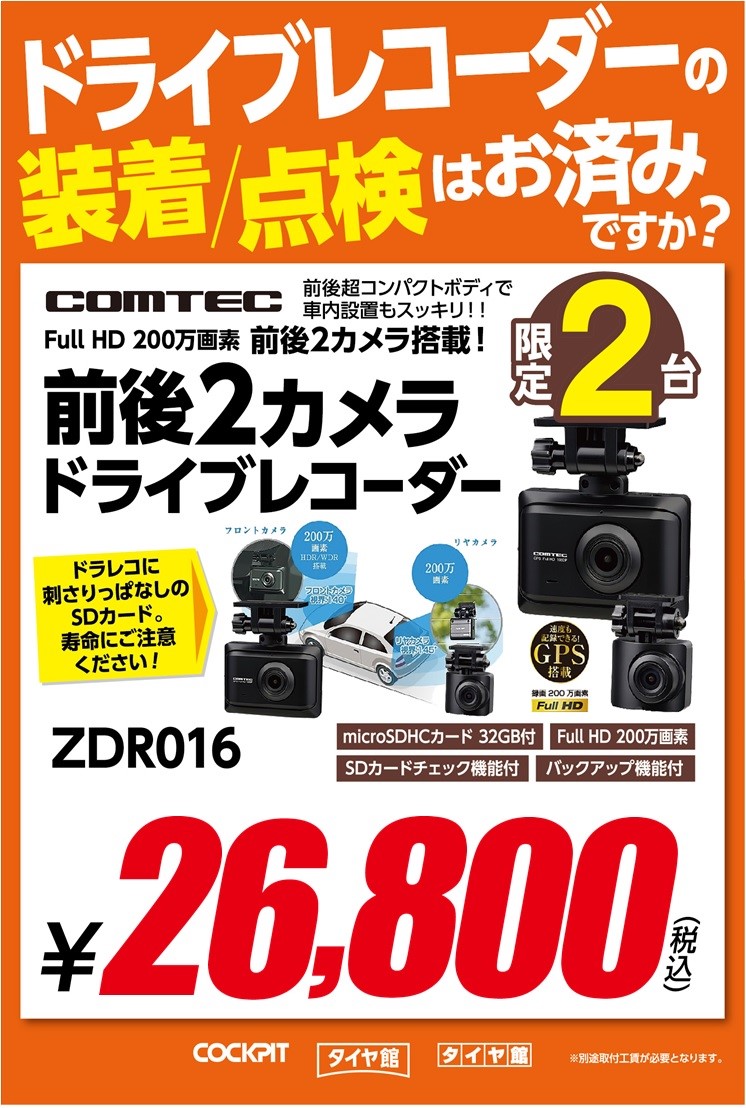 2020.6 debut!! コムテックドライブレコーダーZDR-016 入荷