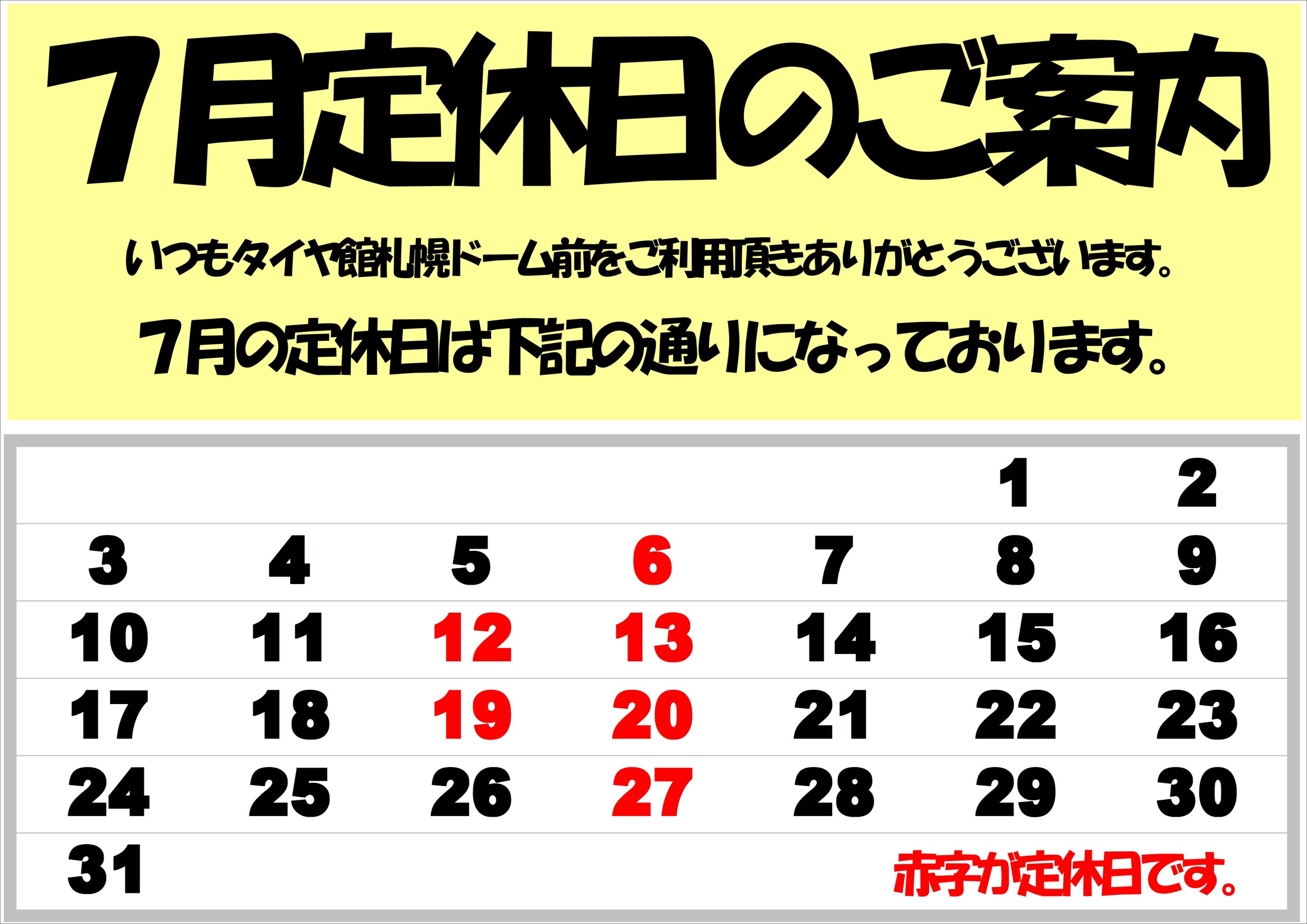 7月定休日のご案内。