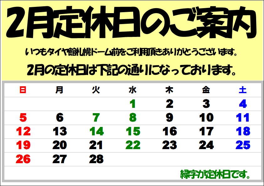 2月に入りましたので、定休日をお知らせします。