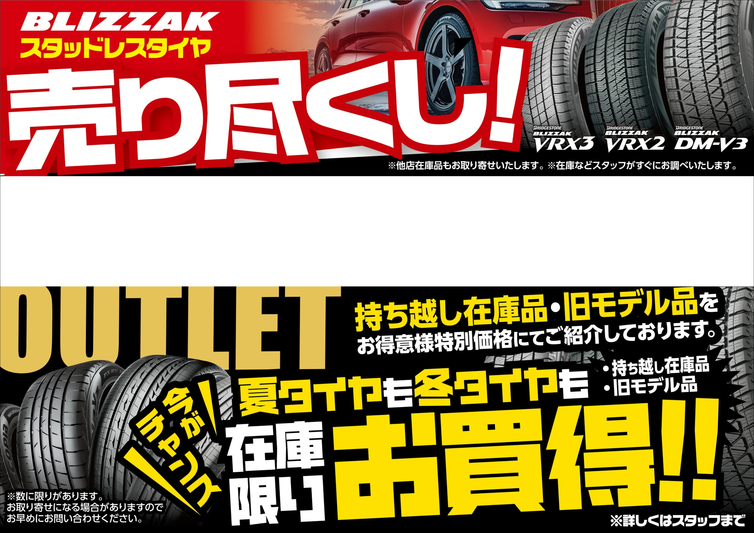 更に、同時開催としまして冬タイヤ売り尽くしセール開催