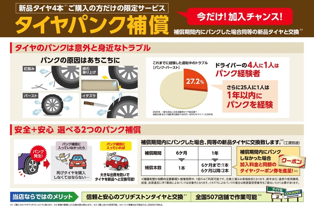 当店には万が一のパンクに備え、【タイヤパンク補償】の加入を推奨しております