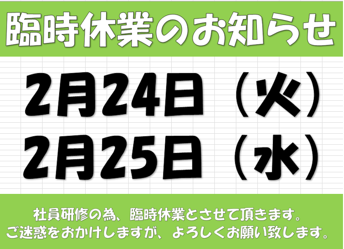 ※2/24(火)は社員研修の為臨時休業とさせていただきます。