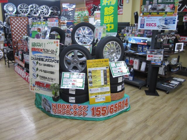 新品のタイヤとホイールをすでに組込済みで展示中!窒素ガスも充填済みです!