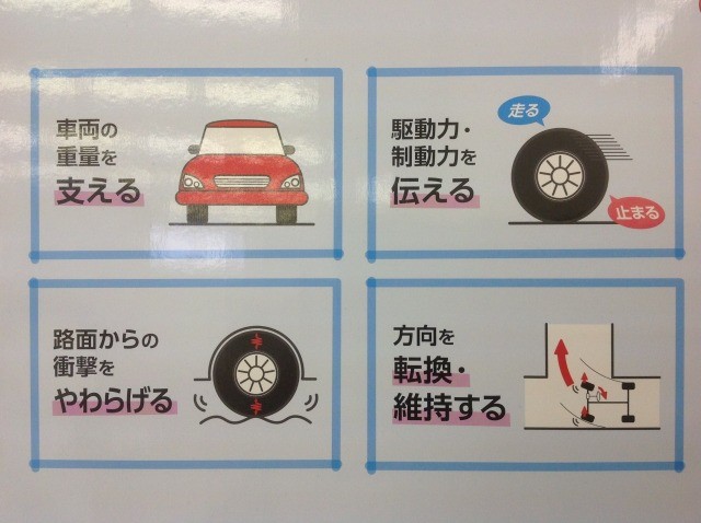 タイヤは、ドライバーの安全安心に関わる重要な部品として、主に4つの役割があるんです!