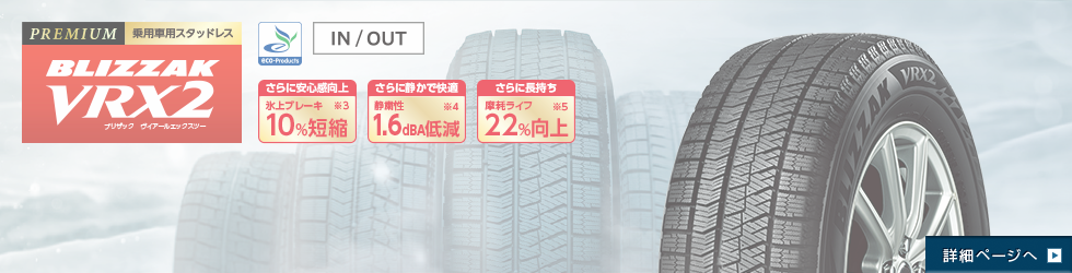 BLIZZAK VRX2(ブリザック ヴイアールエックスツー) ポスト 氷上ブレーキ性能10%アップ、静粛性1・6dBA低減、摩耗ライフ22%向上 関連情報もあわせてご覧ください VRX2 商品詳細はこちらから カテゴリ:商品情報 タイヤ関連