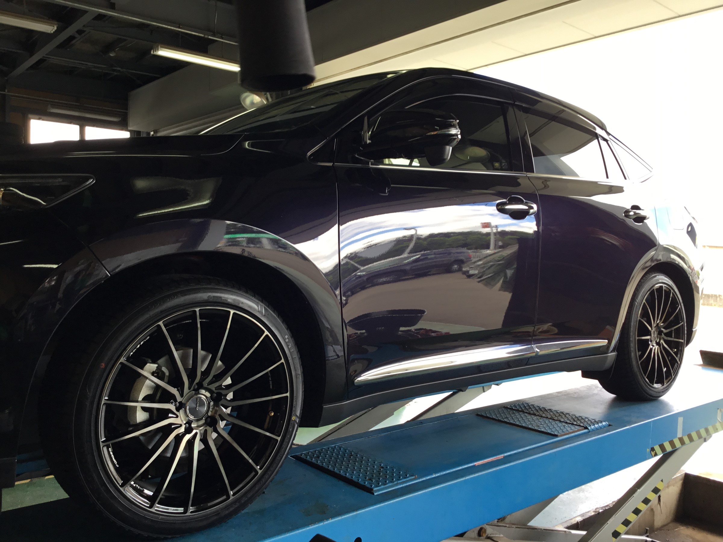 撮影がドヘタの為まあ分かりにくいのですが、こちらのホイールのポイントは鍛造だけではありません。写真を見比べたらわかるように(分からないかも)左右非対称フェイスになっているのです!!