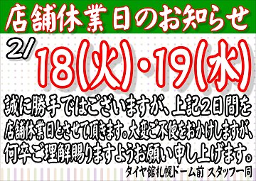 みなさんこんにちは~♪♪ タイヤ館札幌ドーム前です(*´▽`*) 2/20(木)より開催中の 夏タイヤ早期予約大商談会のご案内です。 こちらのイベントは、 2/20(木)~3/16(日)にかけて開催致します! 更に、同時開催と致しまして 冬タイヤ売り尽くしセールを開催っ! 夏タイヤ・冬タイヤ今が購入す...