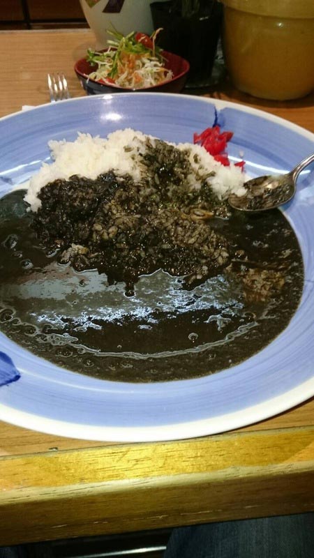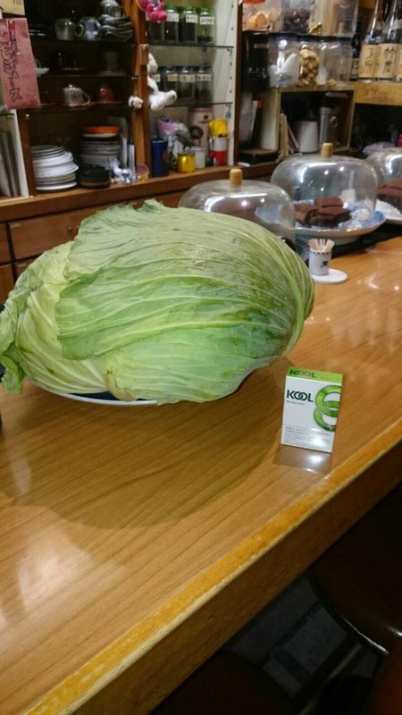 喫茶店にて ポスト 2015年6月1日 この前、とある喫茶店にカレーを食べに行って来ました。そこのカウンターに置いてあったキャベツにビックリしました(>_<)あまりの大きさに!!あとココの黒いカレーも凄く美味しかった!イカスミで黒くしてあるらしくコクがあって、おかわりしちゃいました(*^_^*)場所は四ケ町アーケードのローソンの近くです。 担当:ハシモト