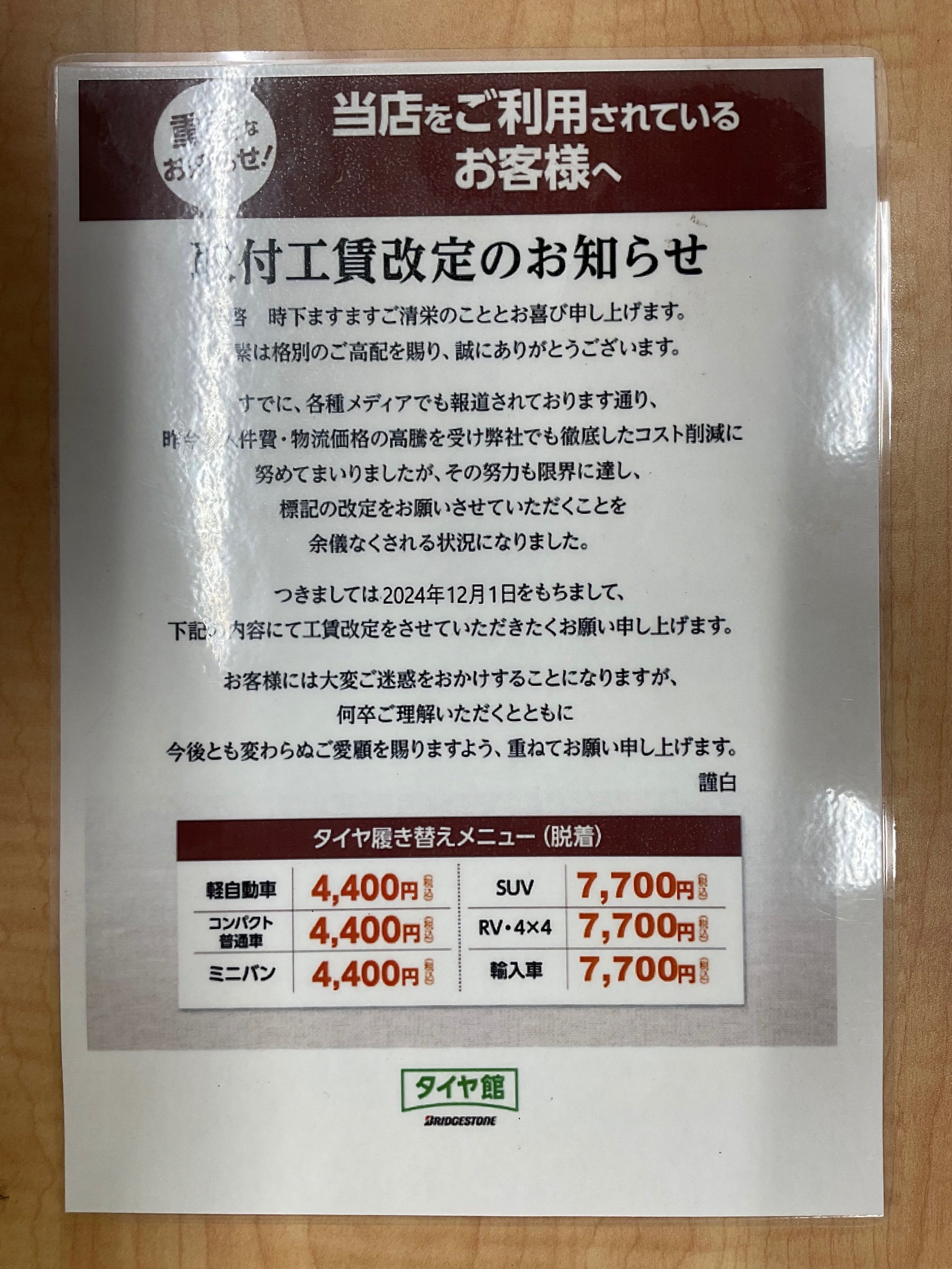 【取付工賃の価格改定について】