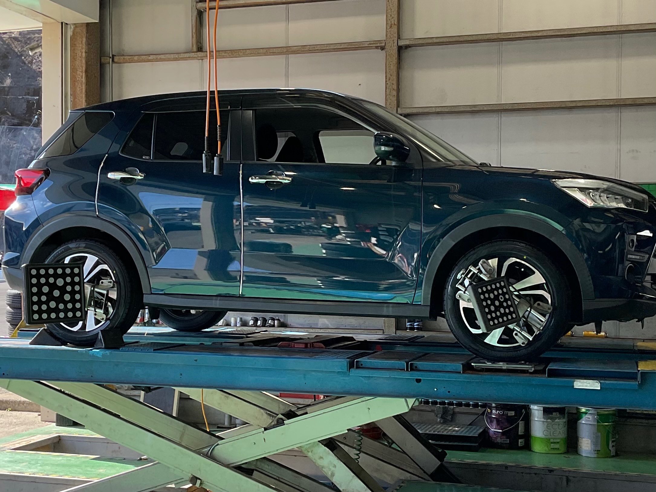 タイヤ4輪に、アライメントテスターを取付し、