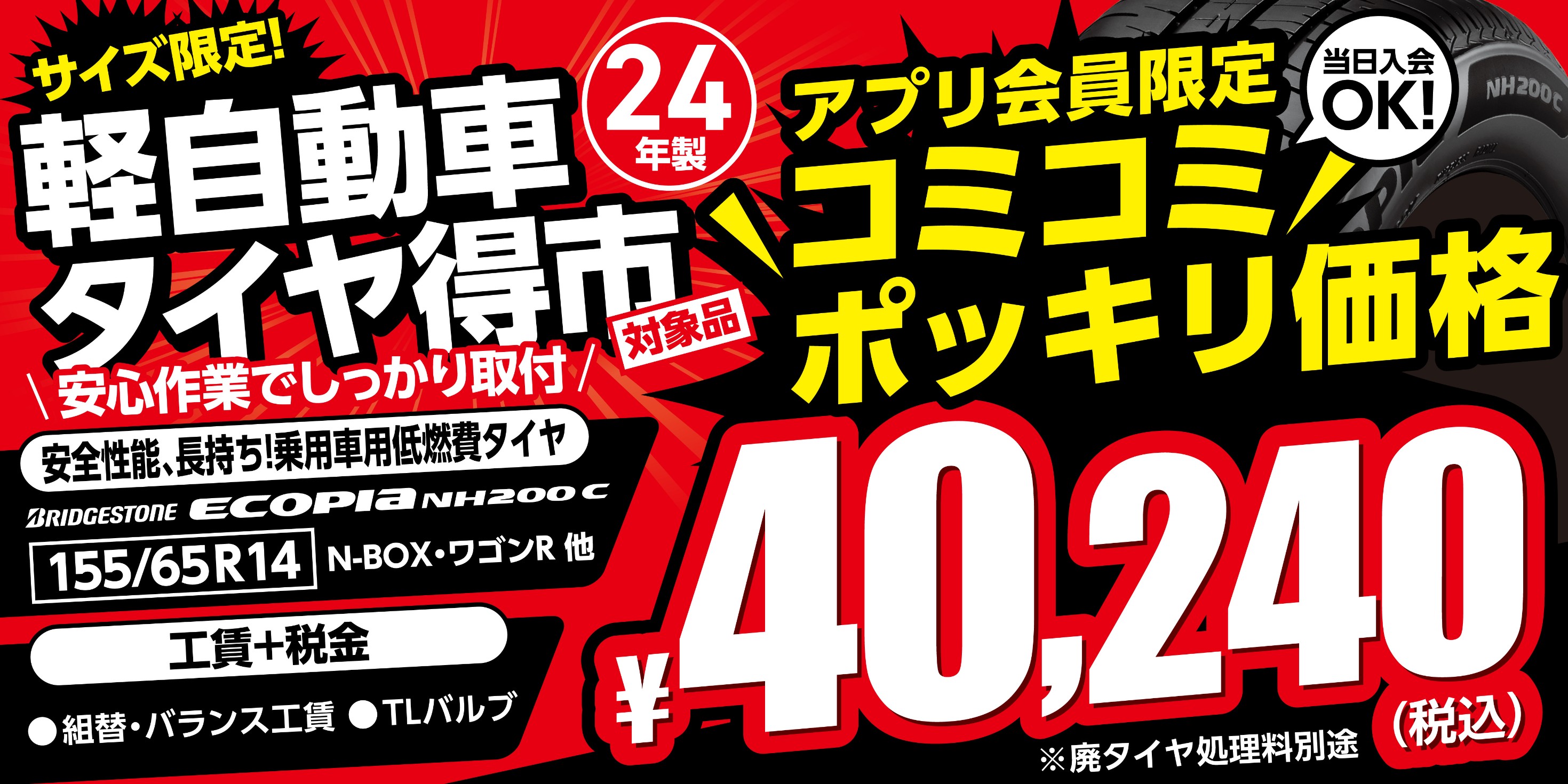 タイヤ館アプリ会員限定‼︎ 特別価格ブリヂストン製タイヤ ECOPIA ポスト 2026年2月21日 タイヤ館アプリ会員限定‼︎特別価格商品のご紹介です。 ブリヂストン製タイヤ【ECOPIA】 ※タイヤサイズ:155/65R14 ※製造年数:2024年 ※タイヤ組替バランス、バルブ交換込価格:¥40,240 税込 ※タイヤ処分料は別途必要です。 在庫ございますので タイヤ館佐世保店までお気軽にご相談ください。 タイヤ館 佐世保 住所:857-1151長崎県佐世保市日宇町2787-2 電話番号: 0956-31-0160 タイヤ点検・安全点検/タイヤ履き替え/オイル交換/その他ピット作業の予約
