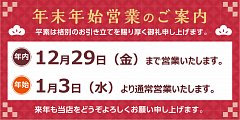 平素は格別のお引き立てを賜り厚く御礼申し上げます。 年末年始営業のご案内です。 年内の営業日も残りわずかとなりました! 年内の営業は、12/29(金)までとなります。 お間違えのないようにお願い致します。 年始は、1月3日(水)より営業となります。 来年も当店をどうぞよろしくお願い申し上げます。