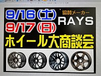 こんばんは! 村田です! ホイール展示会のご案内です 9月の16〜17日にホイールの展示会を開催いたします! 協賛メーカーは、レイズになります^ - ^ どうぞ! ご来店お待ちしております♪