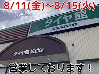タイヤ館佐世保店の お盆期間の営業についてお知らせいたします。 8/11(金)〜8/15(火)まで営業しております! ご予約お待ちしております。 パンクなどの突然のトラブルの際もお気軽にご相談ください。 8/16(水)は、店休日とさせていただきますので お間違えのないようお願い致します。