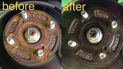 ハブ防錆施工 タイヤを取り外した部分のサビ! これを予防するために施工させていただいています! サビてる部分をとり、防錆コーティング剤を散布したときの写真 before と after です。 ハブのサビは進行すると最悪の場合、タイヤが外せなくなることもあります。 定期的にお掃除することをオスス...