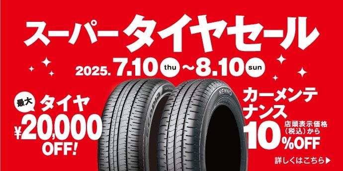 いつも当店をご利用いただきまして、誠にありがとうございます 8/10(日)まで 「スーパータイヤセール」を開催しております ブリヂストンブランドのタイヤを4本ご購入時、 店頭表示価格から、最大20,000円引きのタイヤクーポンだけではなく、 オイル、バッテリー、ワイパーなどのカーメンテナンス商...