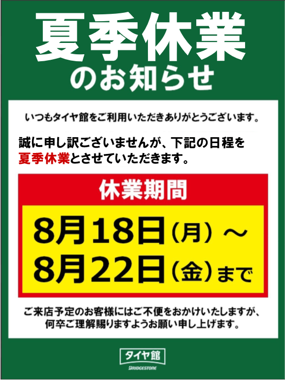 タイヤ館佐世保店より 夏季休業についてご案内いたします 誠に申し訳ございませんが 8月18日〜8月22日の5日間を 休業とさせていただきます。 お間違えのないようお気をつけください。 ご不便、ご迷惑をおかけいたしますが 何卒ご理解賜りますようお願い申し上げます。