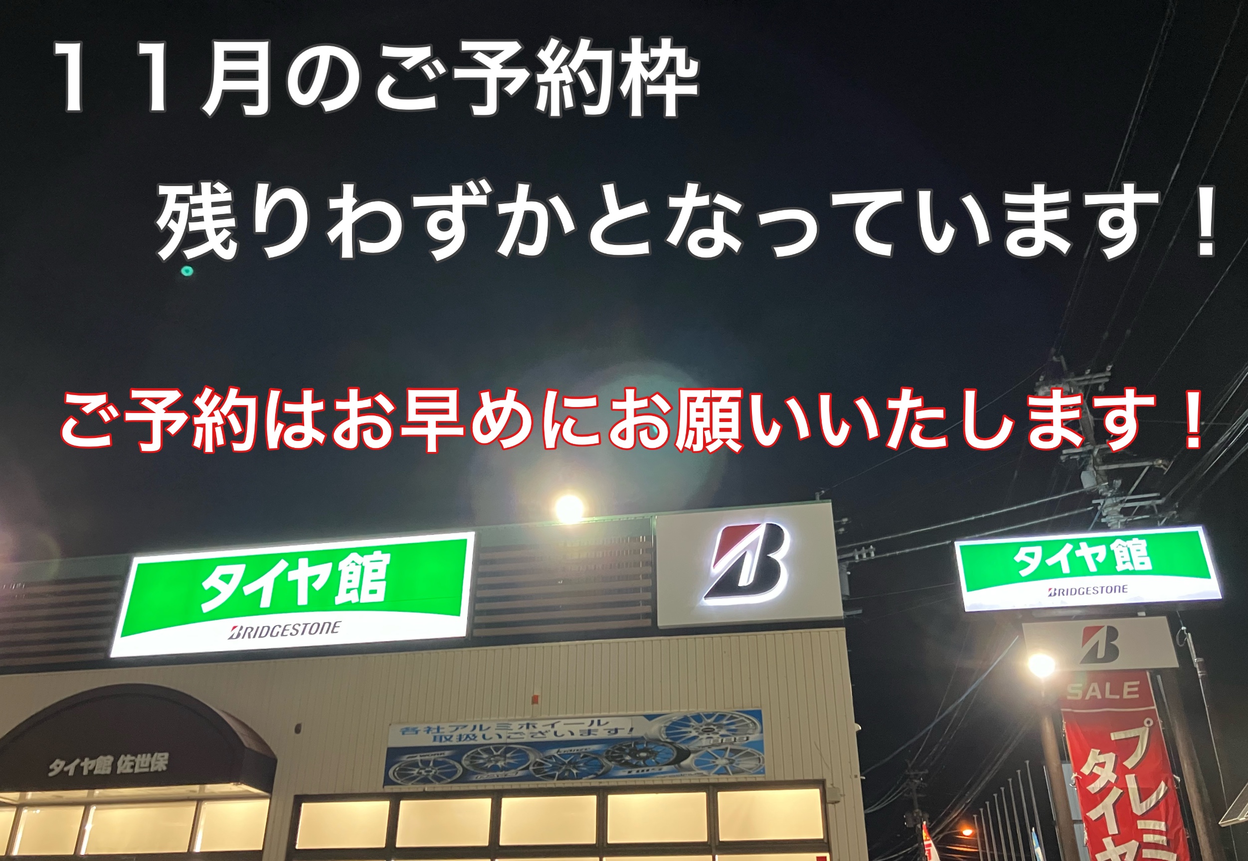 こんにちは、タイヤ館佐世保店です! 11月も下旬にさしかかり、 スタッドレスタイヤへの履き替えのご予約も増えています! 11月のご予約枠も残りわずかとなっております! 沢山のご予約ありがとうございます! 例年ではございますが、 スタッドレスタイヤへの履き替え時期は大変混雑いたします! お...