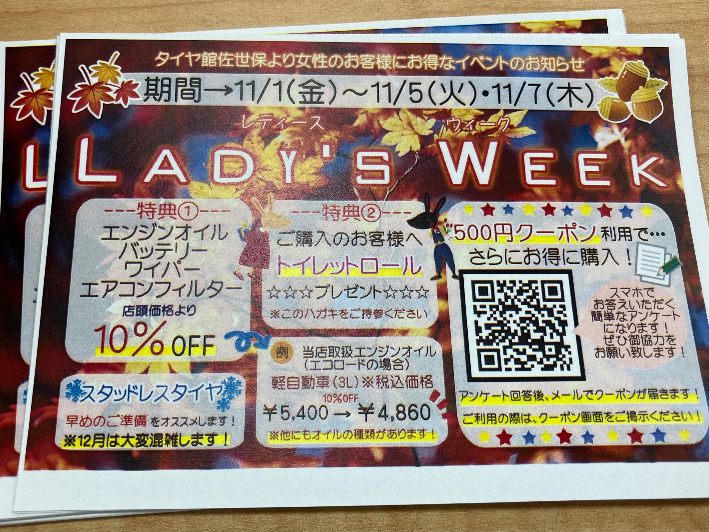 こんにちは、 タイヤ館佐世保より 11月開催のイベント案内の ハガキを発送いたしました! 11/1(金)〜11/5(火)、11/7(木)の期間、 女性のお客様を対象としたイベント レディースウィークを開催します。 イベント期間は、 エンジンオイル、バッテリー ワイパー、エアコンフィルターなど 店頭価格より1...