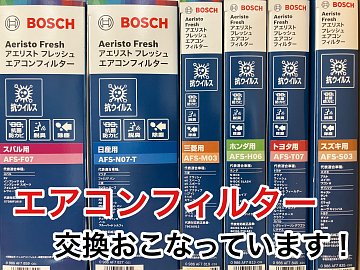 いつもタイヤ館佐世保店のホームページををご覧いただきありがとうございます。 当店は、国産車用エアコンフィルター BOSCH アエリスト フレッシュ の取扱をしております! 皆様は、 クルマのエアコンフィルター、 年に一回を目安に交換されていますか?? 自分では、なかなか見ない エアコンフィ...