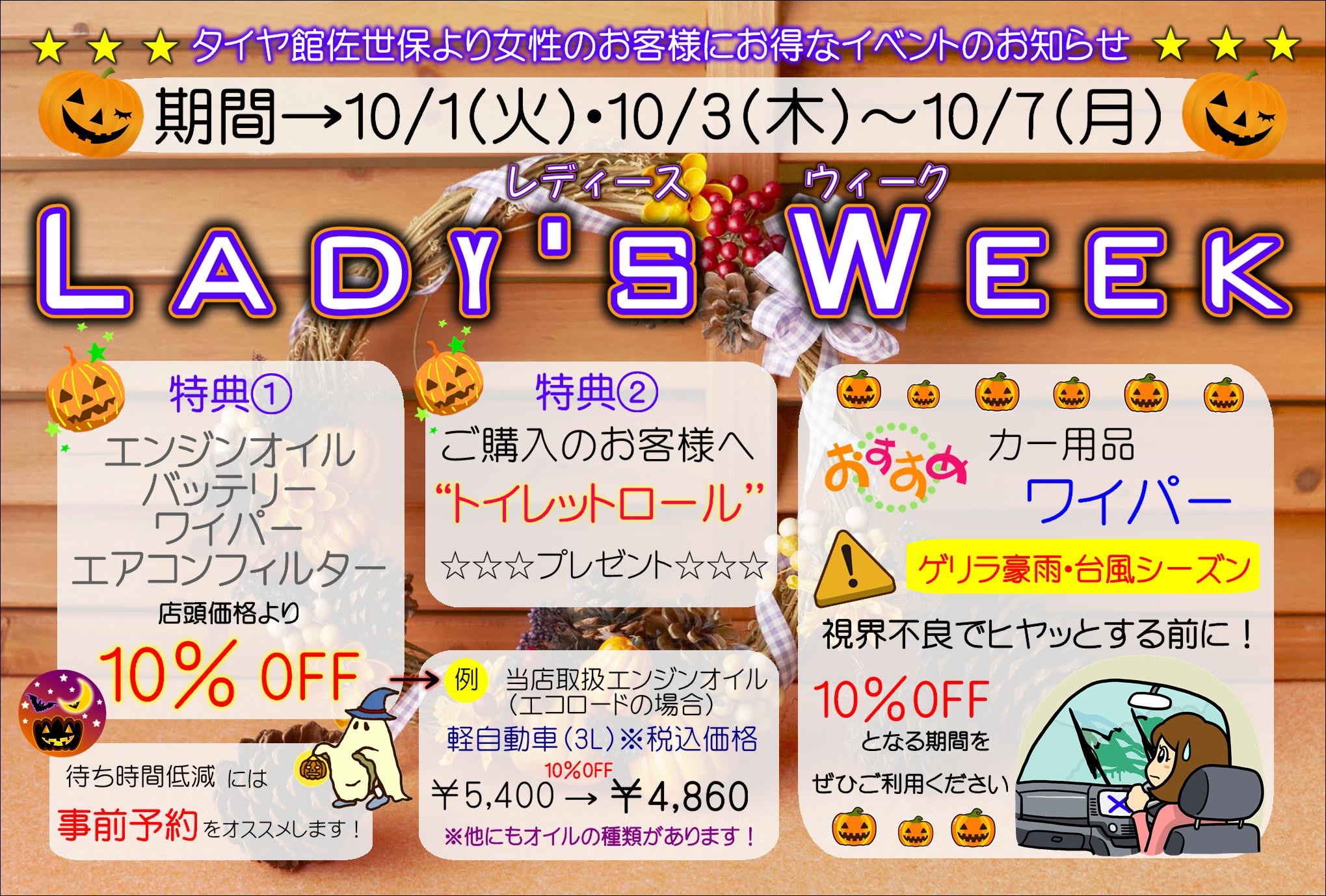 いつもご愛顧いただきありがとうございます。 タイヤ館佐世保より イベント開催のお知らせです! 10/1(火)、10/3(木)〜10/7(月)まで 女性のお客様を対象としたイベント レディースウィーク開催します。 期間中、 エンジンオイル、バッテリー ワイパー、エアコンフィルターなど 店頭価格より10%引...