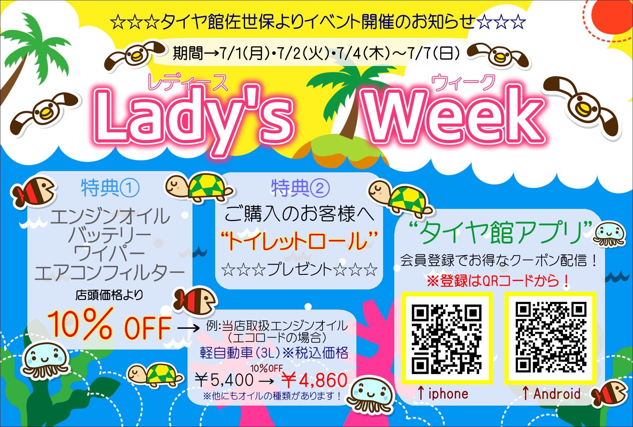 7/1(月).7/2(火).7/4(木)〜7/7(日)の期間、 女性のお客様を対象としたイベント レディースウィークを開催します! 特典① エンジンオイル、バッテリー、ワイパー、エアコンフィルター 店頭価格より、10%OFF!! 特典② ご購入のお客様へ トイレットロール プレゼント! ご予約お待ちしております!