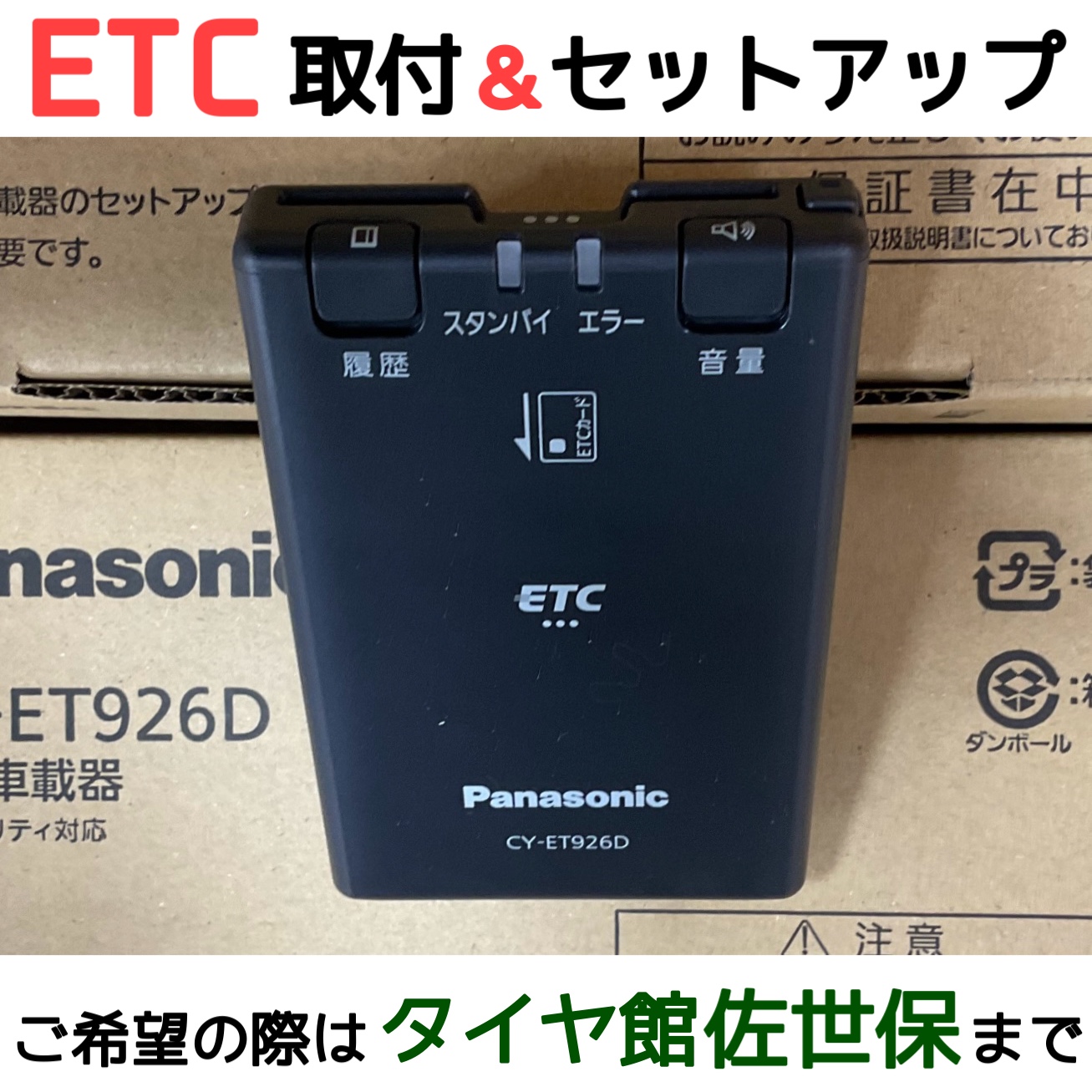 佐世保市日宇町にありますタイヤ館佐世保店です! 当店では ETC 車載器の取付、セットアップ 作業をおこなっております!! 高速道路の通行料金支払い時に ノンストップで通過できたりと 運転中の利便性があがります。 取付後、セットアップまでおこないますので あとは、お手持ちのETCカードをご準...
