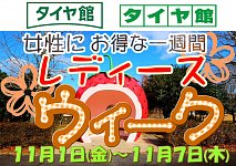こんにちは、 佐世保市 日宇町 にあります タイヤ館佐世保店です。 只今、女性の方にオトクな 10パーセント引きdayイベント レディースウィーク★開催中です! 11/7までとなっております! 男性の方でも!女性の方と一緒にご来店頂きますと10パーセント引きの対象となります(^-^) オイル交換、忘れと...