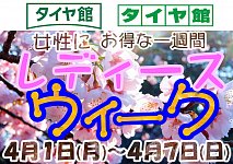 タイヤ館佐世保店の ホームページを ご覧いただきありがとうございます、 4/1 月曜日から 4/7 日曜日の一週間は レディースウィーク 期間となっております! 女性の方 必見 タイヤやエンジンオイル、バッテリーなど 通常価格より10パーセントオフになる お得な一週間です。 男性の方でも 女性の方と...