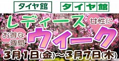 こんにちは。 タイヤ館佐世保店のやまぐちです。 本日 3/1 から 3/7までは 女性にお得な一週間 レディースweek がスタートします。 (※3/6水曜日は佐世保店、店休日 となります。ご了承くださいませ。) タイヤやオイル、バッテリー、ワイパーなどなど通常価格より10パーセントoff!! さらに ご購...