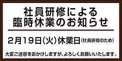 本日 2/19 火曜日 は 社員研修のため タイヤ館全店 休業とさせていただきます。 ご不便、ご迷惑お掛けしますが よろしくお願いいたします。