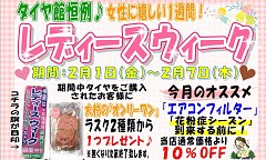こんにちは。 タイヤ館佐世保店 です。 当店の毎月の恒例イベントであります 女性にお得な一週間☆ レディースウィーク のご案内ハガキを いつもご利用いただいてるみなさまへ 送らせていただきました! 開催日♪ 2/2から2/7までの一週間 タイヤ、オイル交換やバッテリー交換など通常価格より10%オフ...