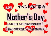 こんにちは。タイヤ館佐世保店の山口です。 GWも終わり、次のイベントといえば・・・ 5月13日(日)の☆母の日☆ですね~ 母に何をプレゼントしようかまだ悩み中な私です・・・笑 はやく買いにいかなきゃですね・・・笑 ということで!!タイヤ館佐世保店では 母の日イベントを開催いたしますよ...