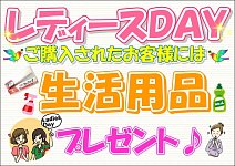 2018年もあります!! 女性の方にお得な日 ☆ レディースデー ☆ 今月はご購入して頂いたお客様に 生活用品をプレゼントします♪ ご来店お待ちしております!