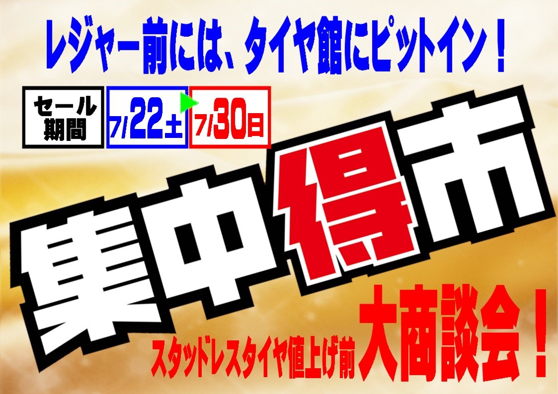 ☆大売出しのお知らせ☆ ポスト 2017年7月20日 今月も開催します集中得市!! 22日(土)~30日(日)迄となっております!夏のレジャー前にタイヤ館で無料点検はどうでしょう!手間も時間もお金もかからず、愛車の健康診断できちゃいます♪また、9月1日より値上げしますスタッドレスタイヤの大商談会を実施します☆たくさんのお客様のご来店タイヤ館佐世保北店スタッフ一同お待ちしております(^^)/ カテゴリ:お知らせ