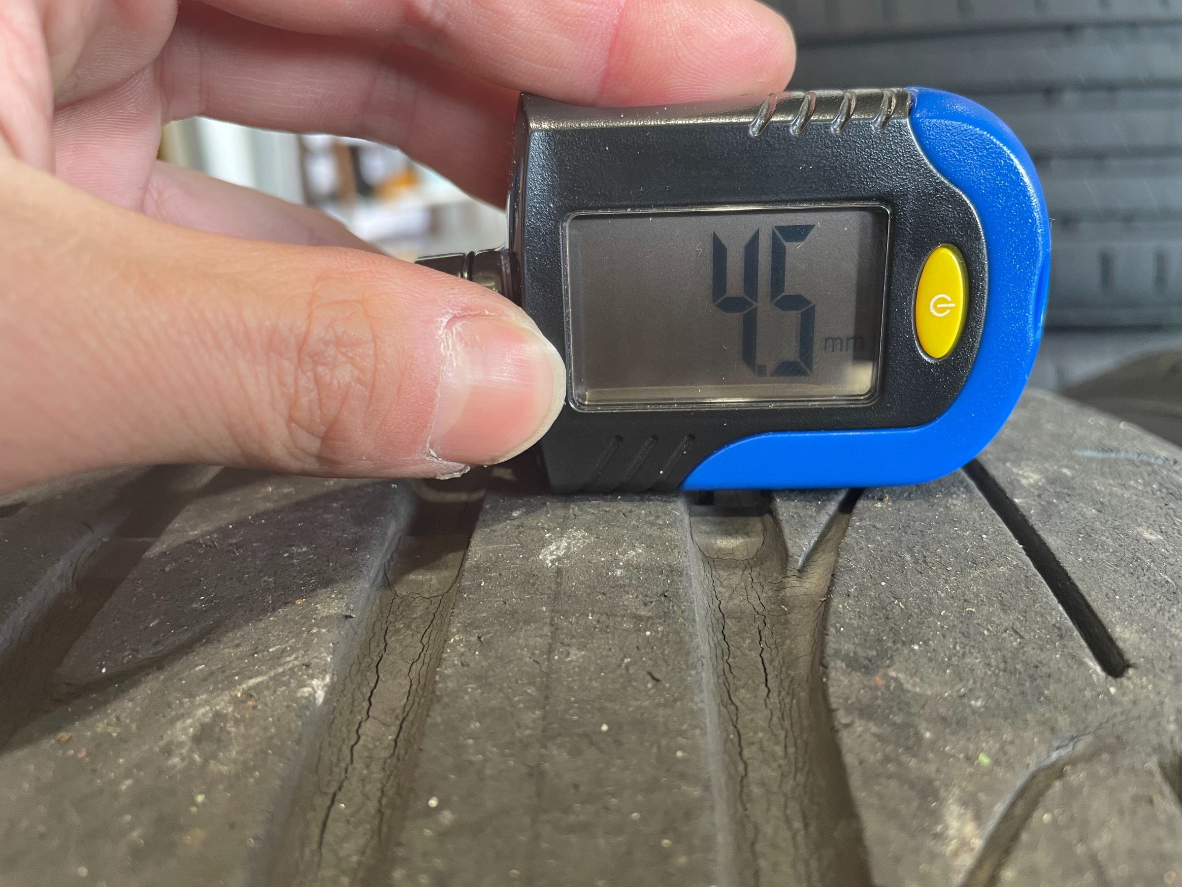 しかしゲージの下を見て分るように主溝にヒビが入ってきている為交換となりました。タイヤは新車から付いているタイヤなので刻印を見ても5年ご使用になってます。(2016という数字は2016年の20週に製造されたタイヤの意味を表しています)