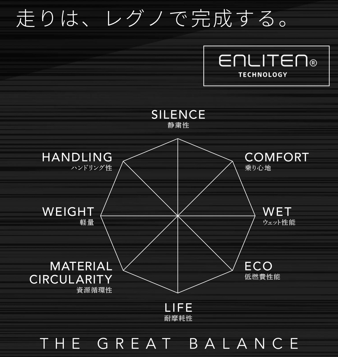 REGNOのグレートバランスを表す六角形も八角形になり、軽量、資源循環性が増えました!