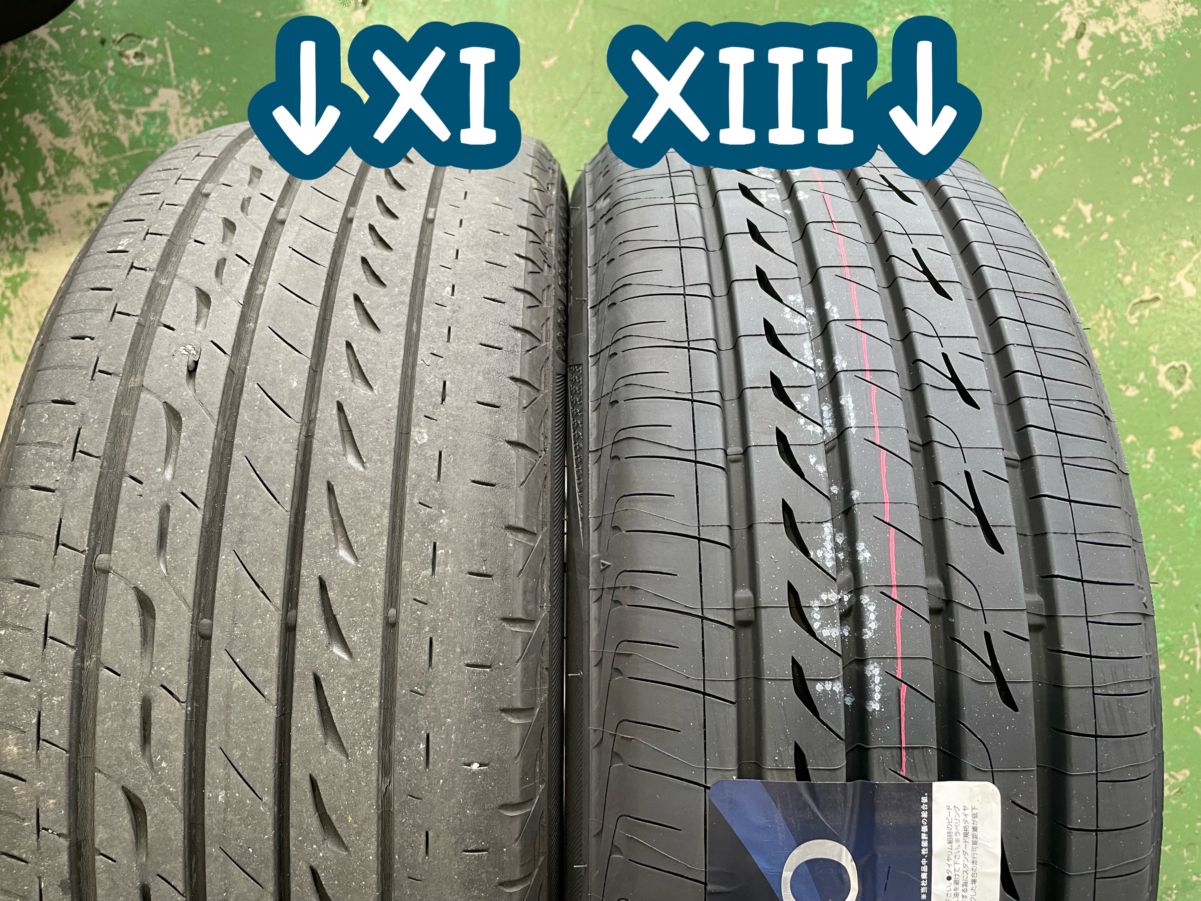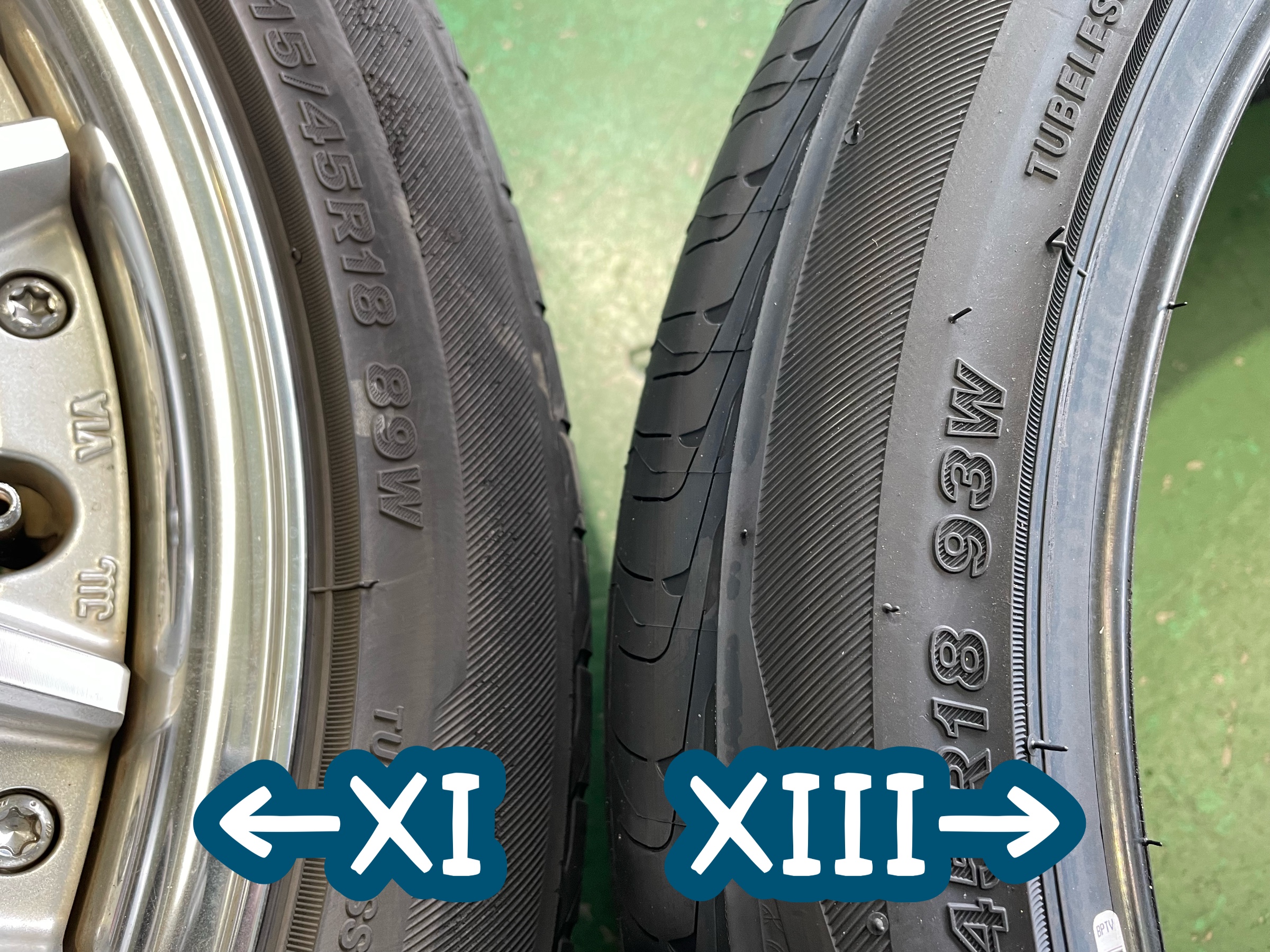 サイドのデザインはカッコよく(私的に笑)なっています。それ以外の違う点が一つ、ロードインデックス(荷重指数)がXL規格に変わっている為89→93XLと上がっています。ホイール付きで置いた時XIの時は一部分ホイールが地面に設置し、コツっと音がしてましたがXIIIは音がしません。なのでしっかり支えてくれそうですね!